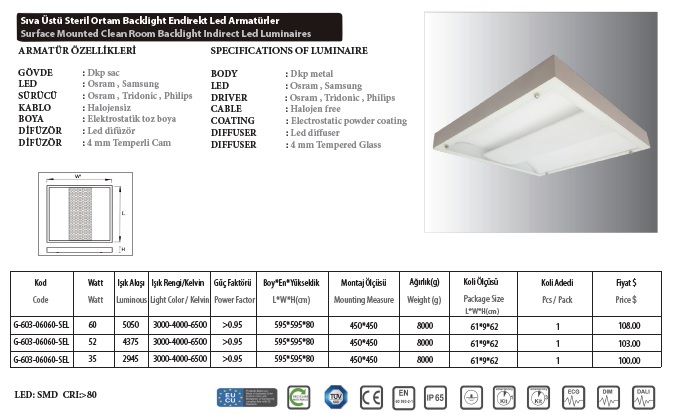 Sıva Üstü Steril Ortam Endirekt Led Armatürler IP65